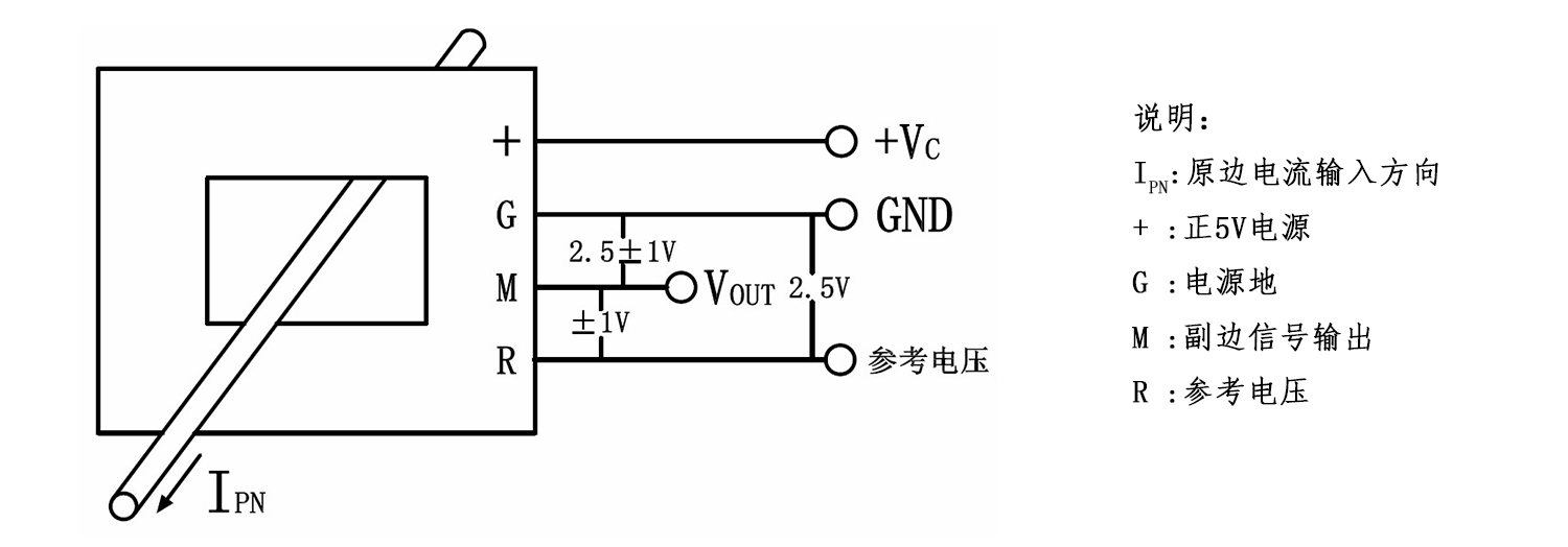 该传感器采用磁平衡霍尔电压检测原理工作。原边电流产生的磁通量与霍尔电压经过放大产生的副边电压,通过副边线圈所产生的磁通量相平衡,副边电压便能精确地反应原边电流。